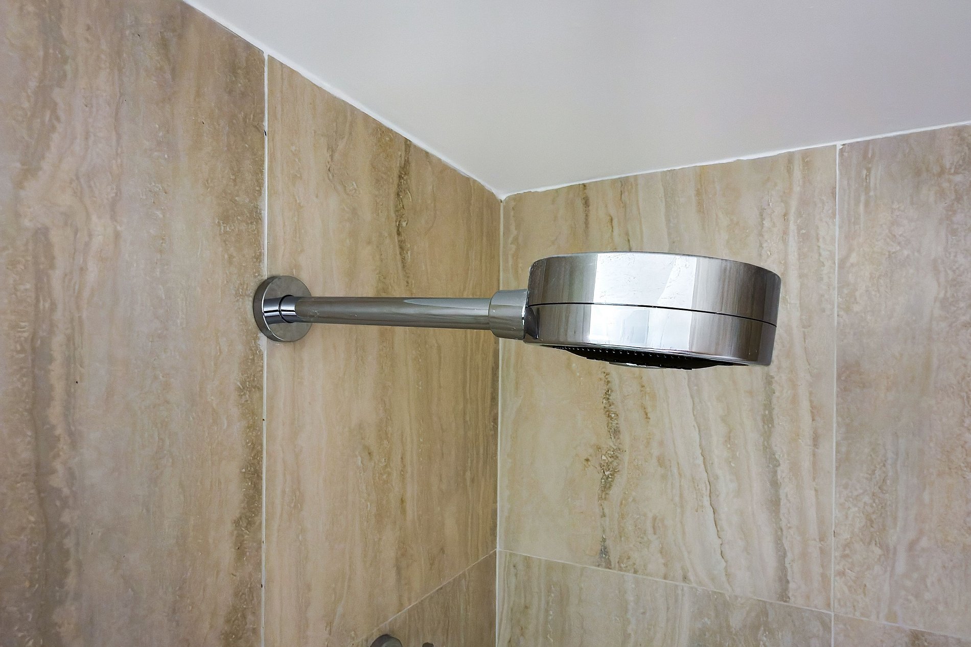 Towel racks for up to 4 towels, large mirror, exhaust fan, soap dish, and liquid soap available.