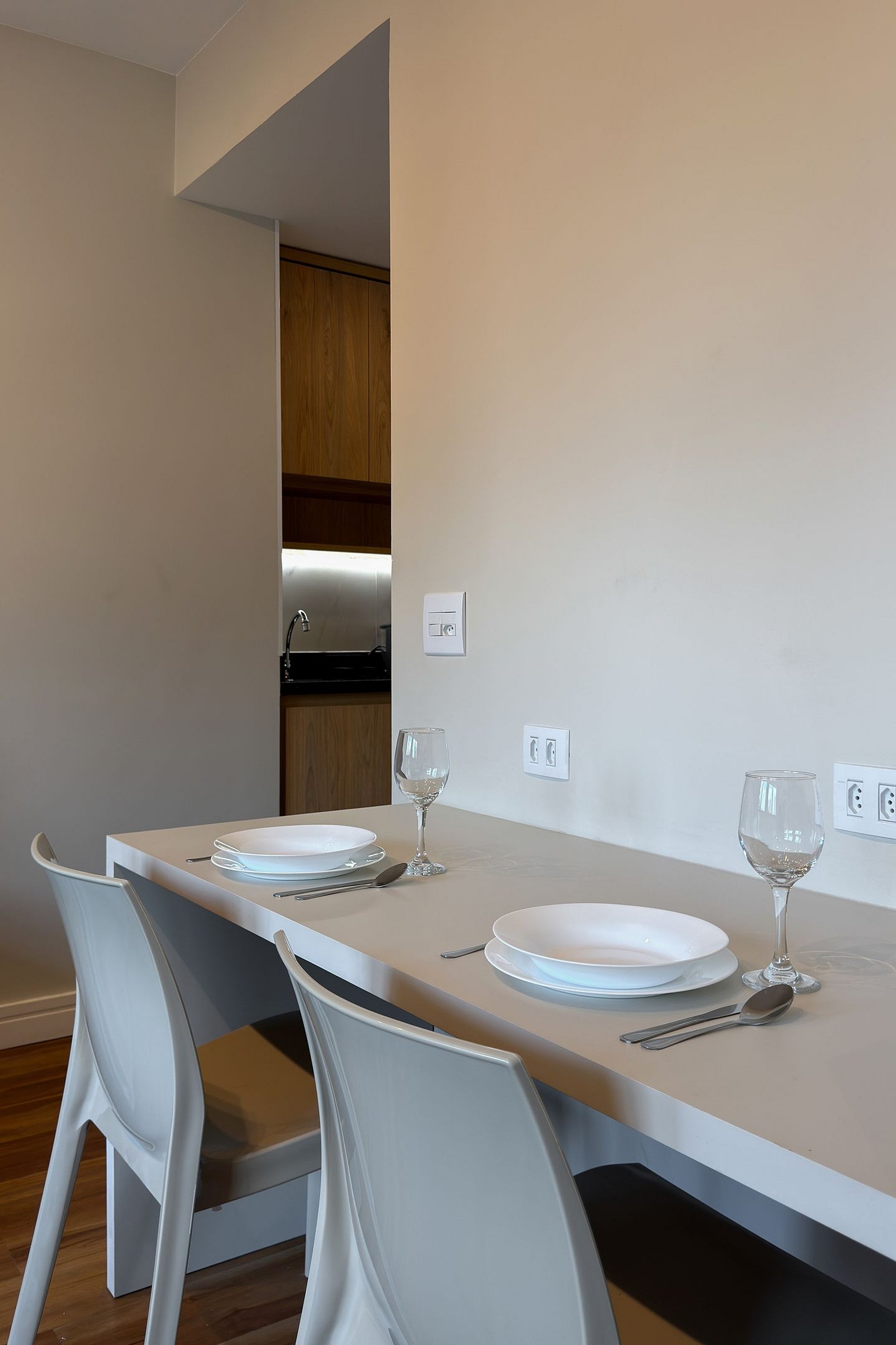 La cocina totalmente equipada incluye placa de inducción, microondas, frigobar y utensilios, mientras que la barra de trabajo con sillas ergonómicas lo convierte en el espacio perfecto para trabajar a distancia.