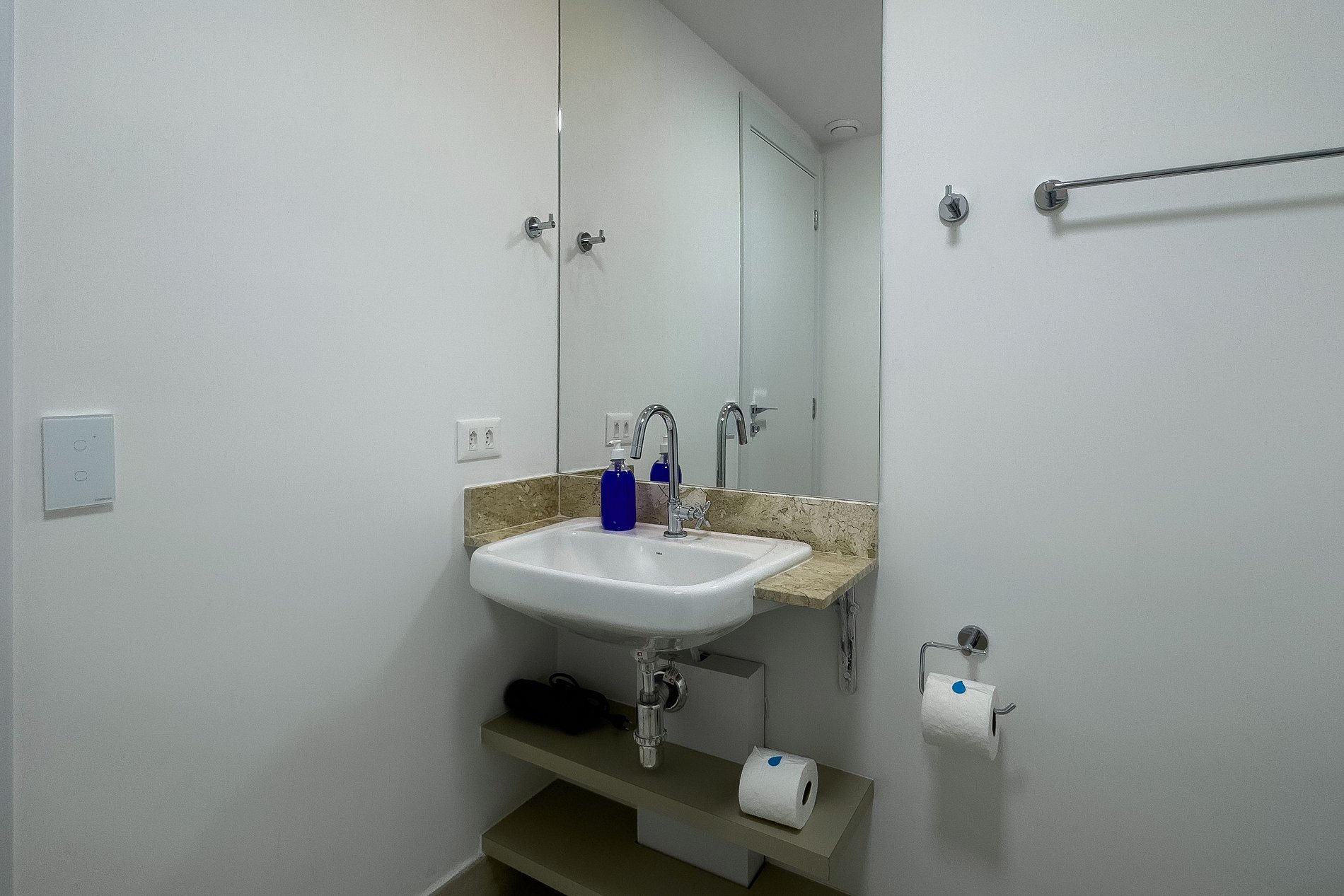 - Metais para até 4 toalhas, espelho amplo, exaustor, saboneteira e sabonete disponível.