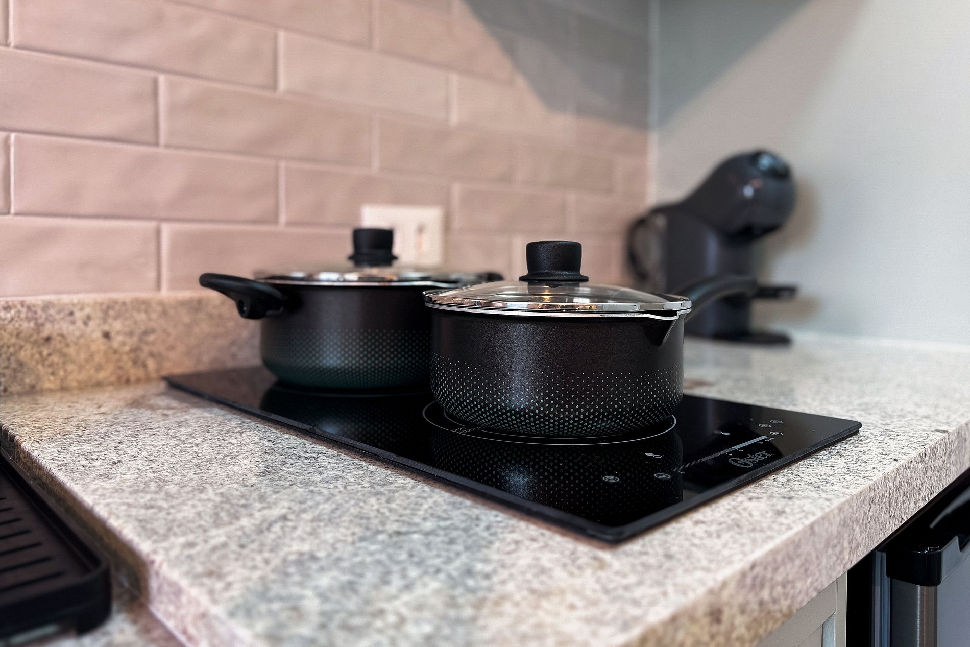 - Completamente equipada: cooktop de indução, micro-ondas grande, geladeira com freezer, cafeteira Dolce Gusto e utensílios essenciais (incluindo taças de vinho).