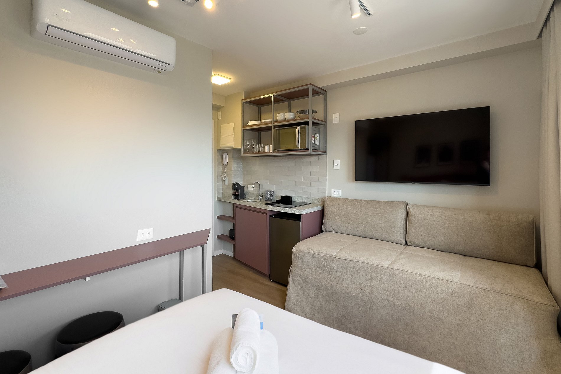 O nosso estúdio foi pensado para oferecer a mesma praticidade de um hotel com o conforto e acolhimento de um lar.